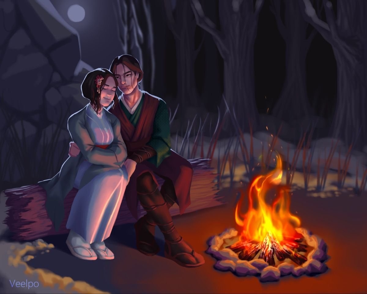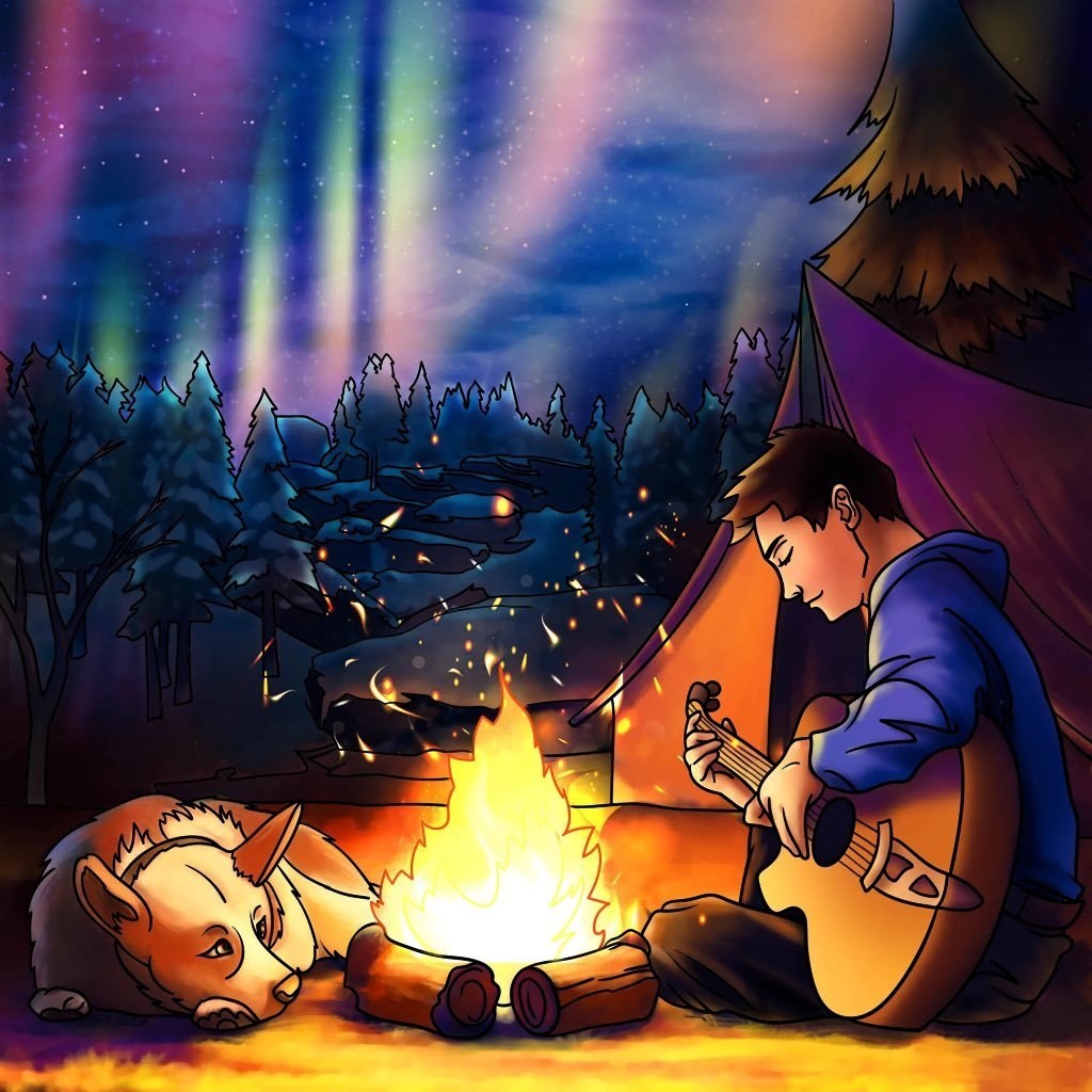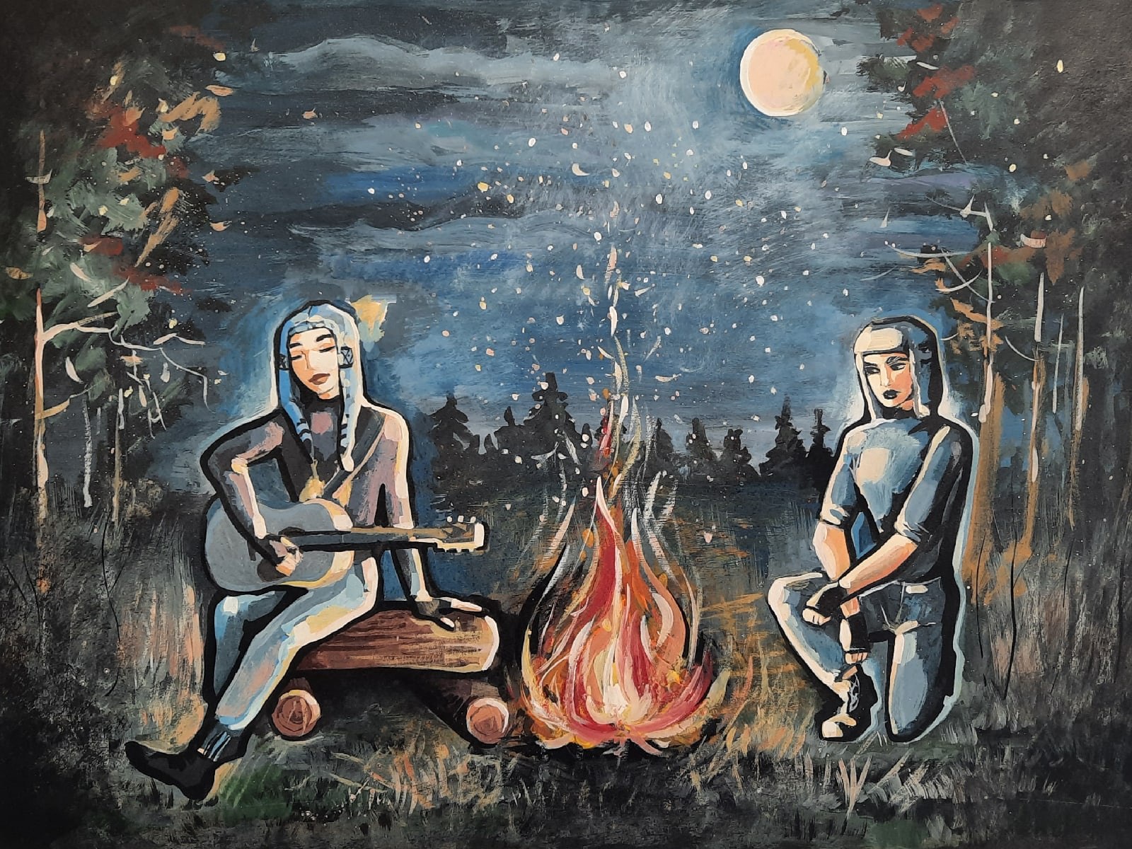 Двое у костра ночью арт
