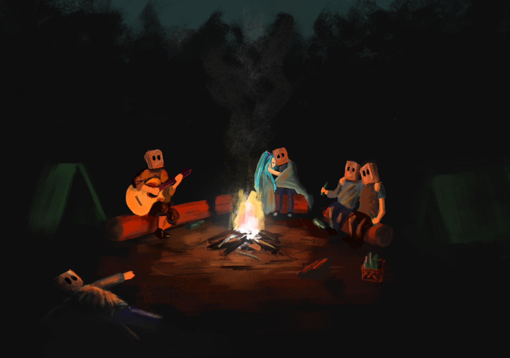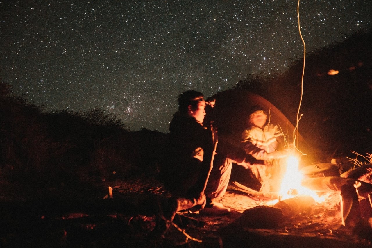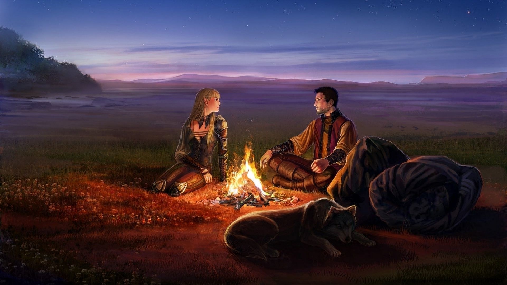 Двое у костра ночью арт