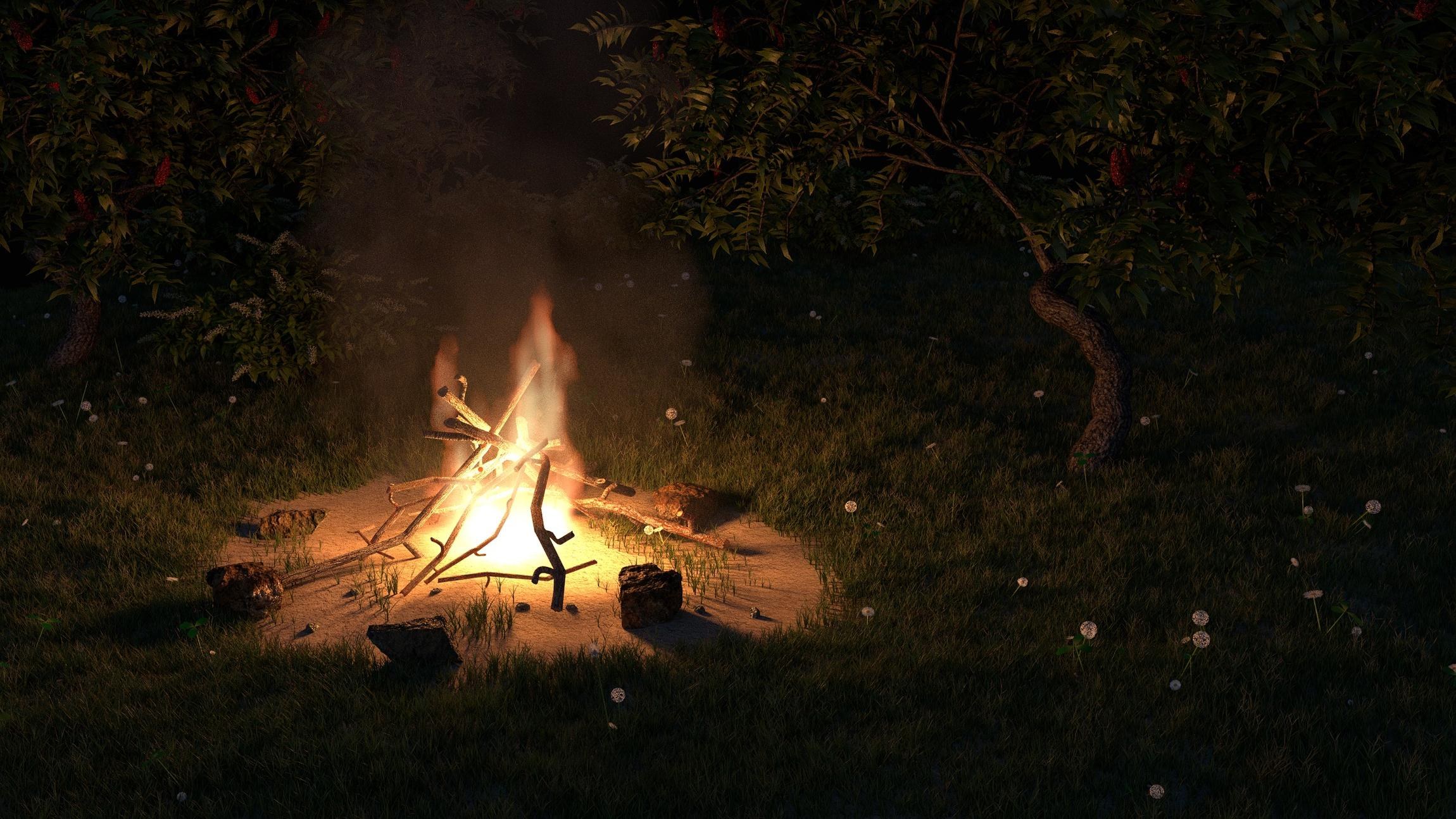 Фэнтези арт костер в лесу вечером
