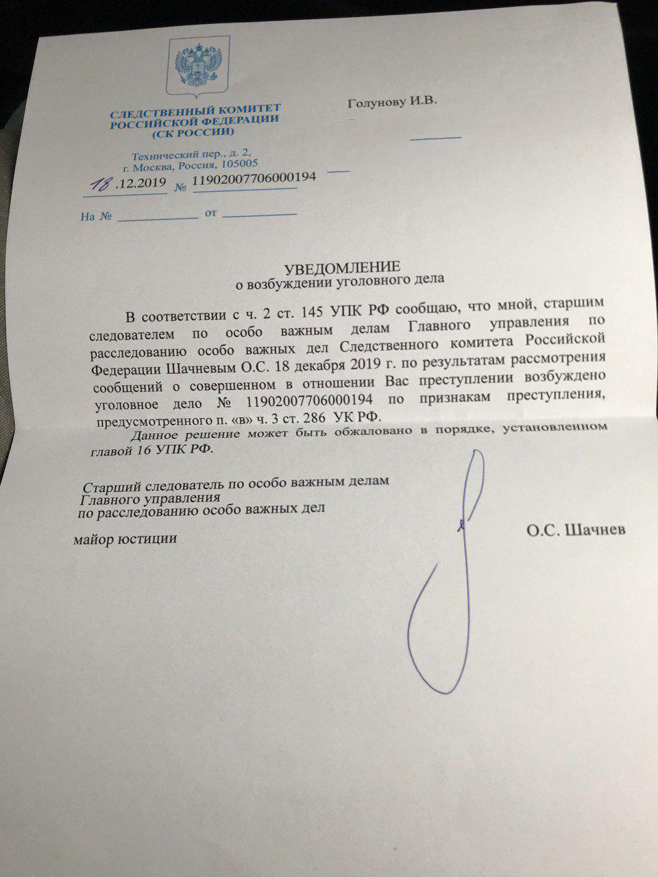 Уведомление Следственного комитета