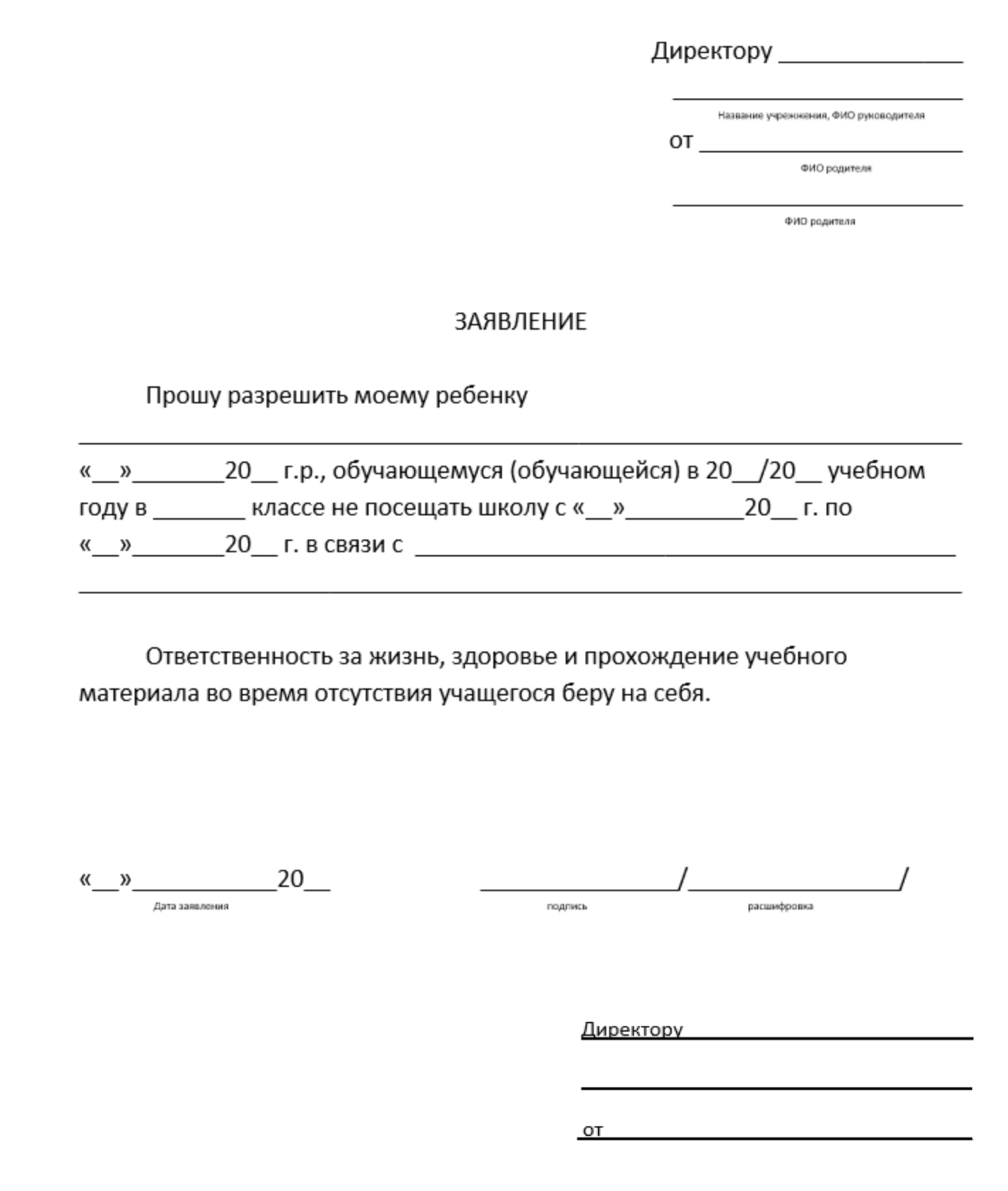 Пример заявления в школу об отсутствии ребенка