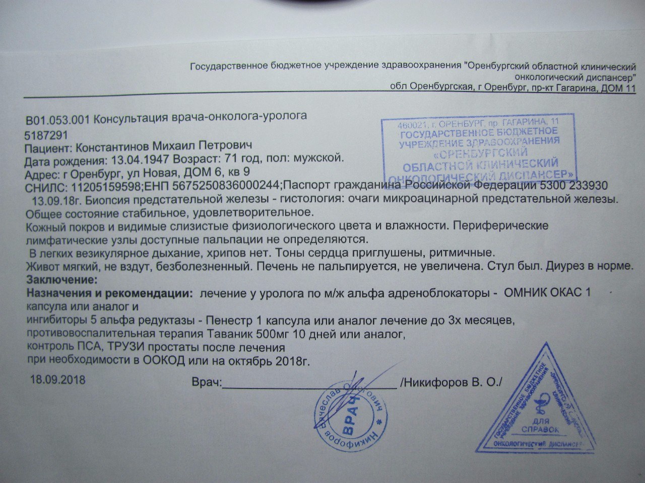 Заключение врача онколога